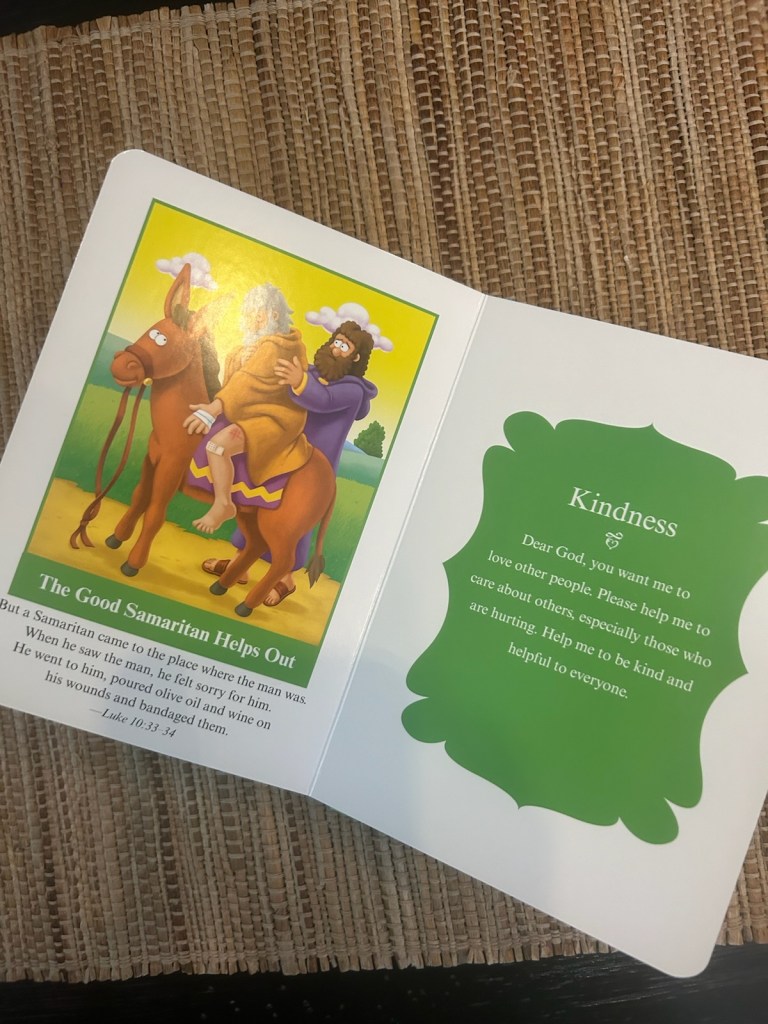 My two year old grandson has a simple beginner’s prayer book, My First Book of Prayers by ZonderKidz. He loves it. When we read stories before bed, he is drawn to it and listens carefully. There’s an illustration on each page from a Bible story, and then there’s a simple prayer regarding that topic. There are simple teachings and prayers for: gratitude, hard work, forgiveness, wisdom, courage, friendship, purpose, peace, sharing, kindness, honestly, love, happiness, generosity, patience, and it ends with The Lord’s Prayer.